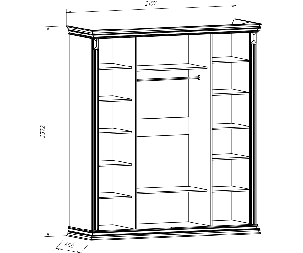 Pèse 190kg. Il repose sur des pieds sculptés ; un miroir est installé au centre à toute hauteur. La partie intérieure de l'armoire a une section avec des étagères et un grand espace pour les choses à trembler. La façade est en chêne naturel.