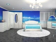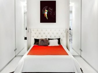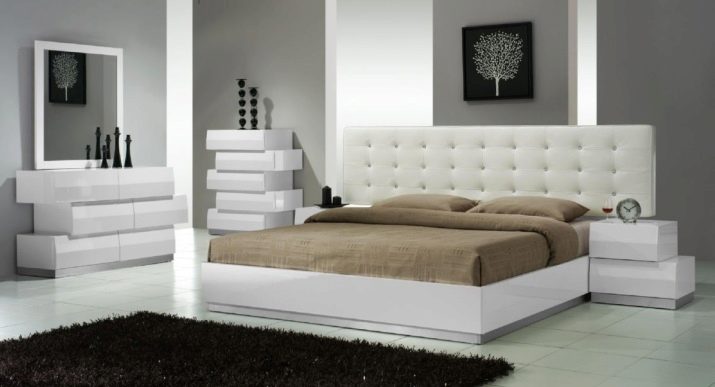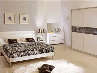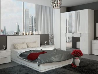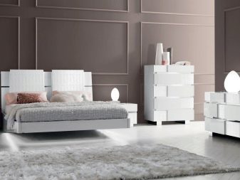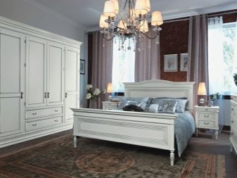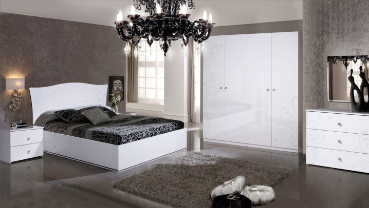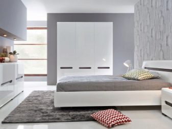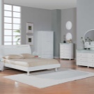 Si les murs sont clairs, alors en combinaison avec des meubles blancs, l'intérieur semblera léger, spacieux et aéré. Si les murs sont sombres, l'ensemble de chambre à coucher se démarquera particulièrement et semblera encore plus blanc. Dans le même temps, l'intérieur de la chambre en noir et blanc a l'air noble et strict.