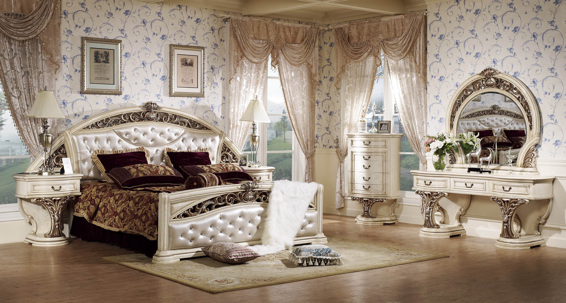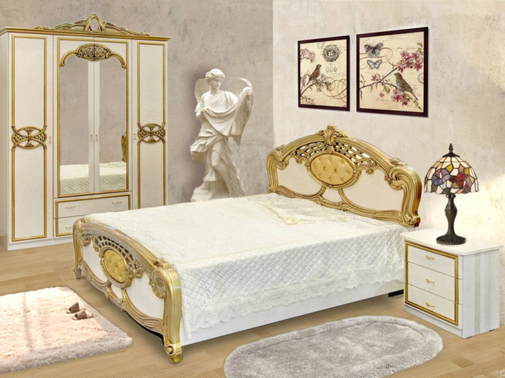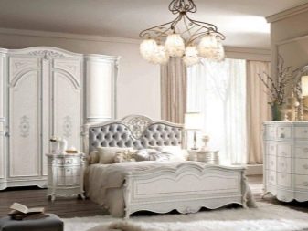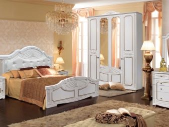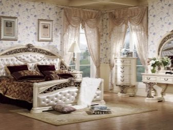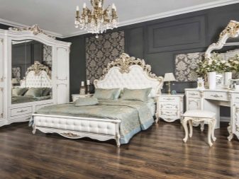 L'ensemble le plus luxueux sera réalisé dans le style baroque. Ce sont le chic du palais, la splendeur, le coupleur de chariot, les éléments décoratifs complexes, les motifs en relief. Les inserts et les raccords peuvent être en or, en cuivre ou en argent. Une tête de lit exquise est un must. Un tel ensemble est conçu pour une pièce spacieuse.