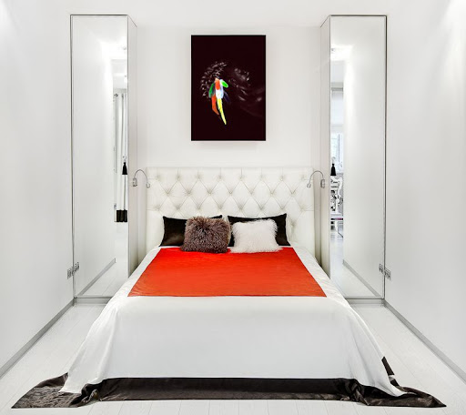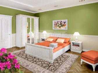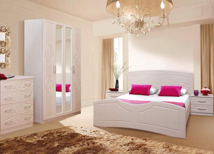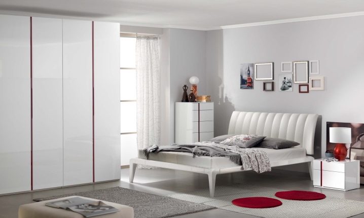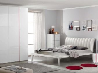 La couleur blanche est combinée avec presque toute la palette de couleurs. Il est important de se rappeler que la chambre est un endroit pour se détendre, et donc des teintes calmes doivent être choisies pour ne pas exciter le système nerveux. Par exemple, le blanc se combine chic avec le rouge, soulignant favorablement la teinte vive. Mais le système nerveux ne se détendra pas dans un tel intérieur.