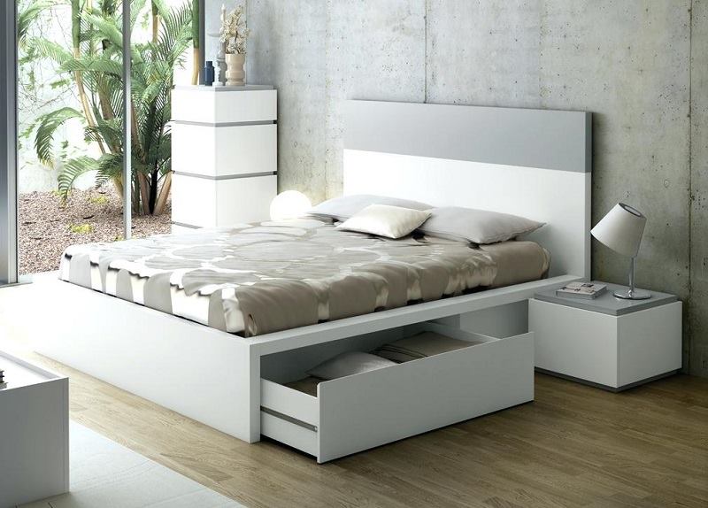 Si la pièce est étroite, les tables de chevet peuvent ne pas s'adapter. Ils n'ont pas besoin d'être deux - vous pouvez en limiter un ou ne pas en acheter du tout. Sans eux, l'intérieur semble plus spacieux et moderne.