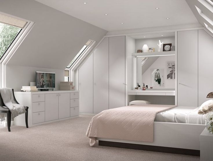 Si la pièce est sous un toit, le lieu de couchage doit être situé sous un plafond plat ou au point le plus élevé. Dans les endroits où le toit est en pente, il est conseillé de placer une commode, des armoires basses ou un espace de travail. Si la pièce est étroite, il vaut mieux refuser les tables de chevet. Ils peuvent être remplacés par des étagères à charnières à la tête de lit.