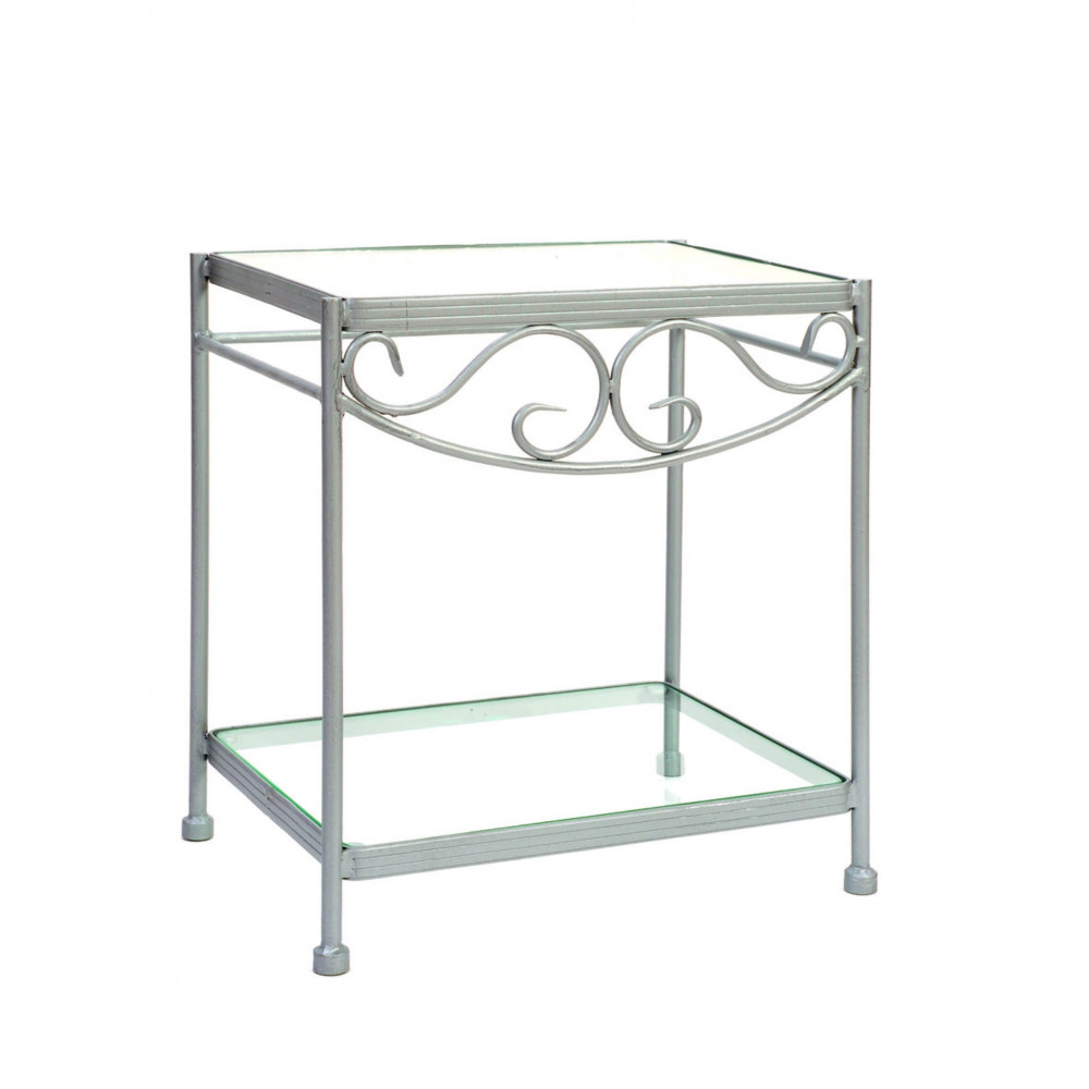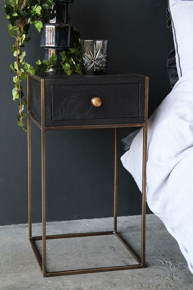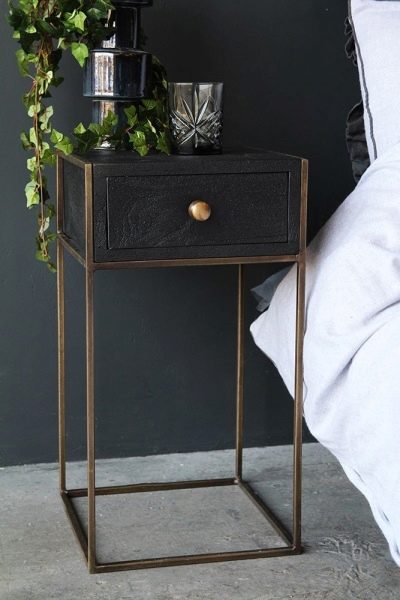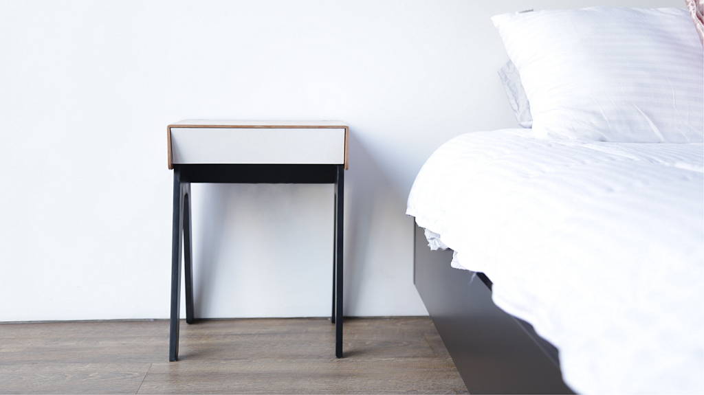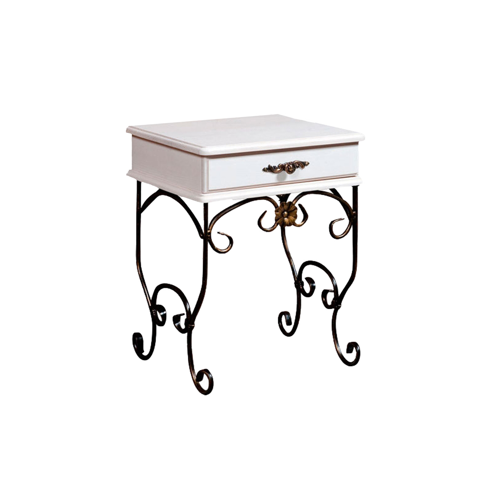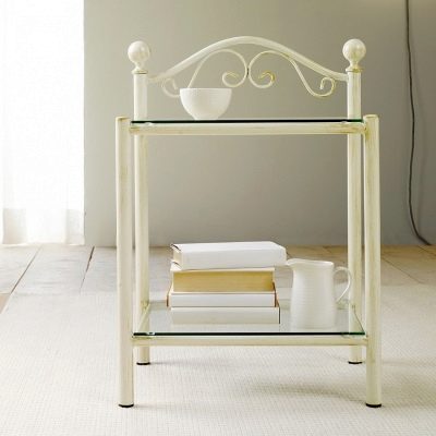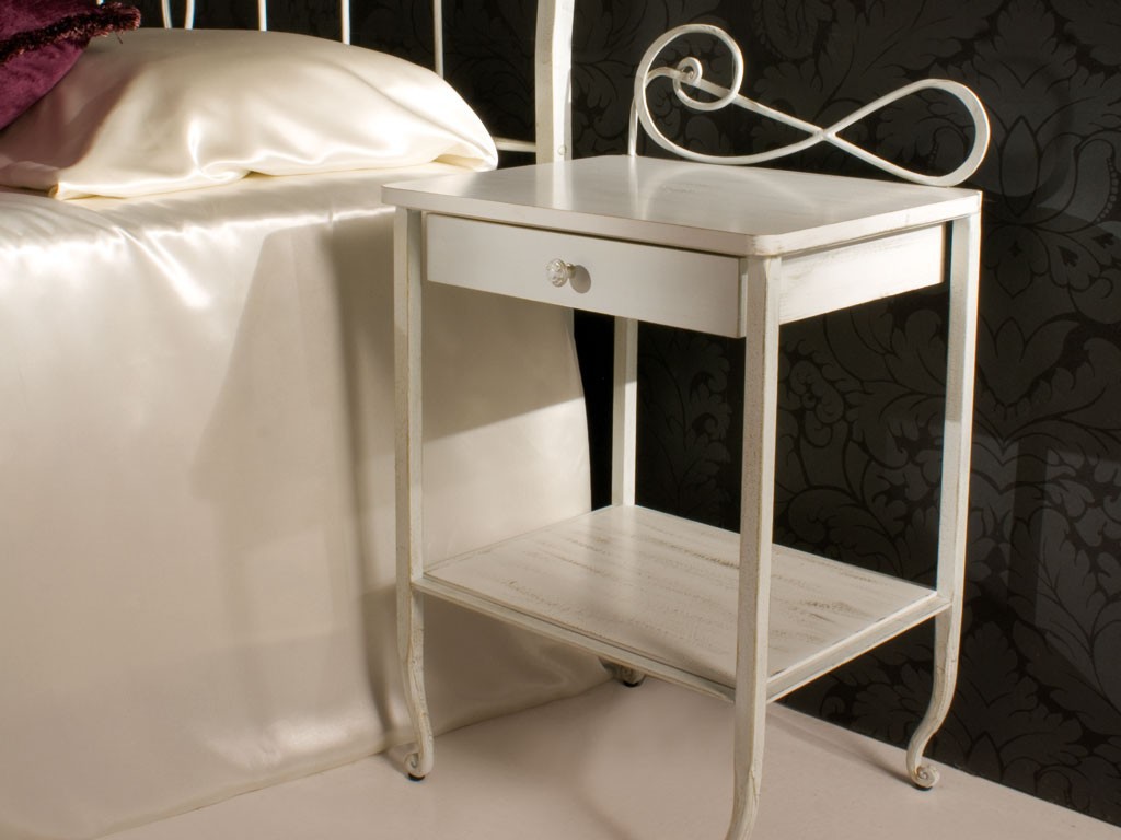 - Table de chevet en fer blanc. Il est similaire en couleur et en style à la tête de lit.