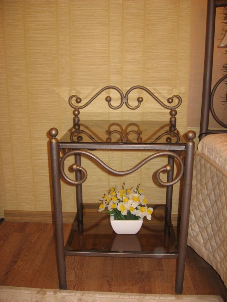Les tables de chevet forgées gratuitement sont plus chères que les meubles estampés. Cependant, fabriquer un meuble sur commande auprès d'un maître est une bonne occasion d'acheter des meubles exclusifs en un seul exemplaire.