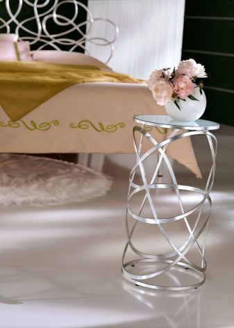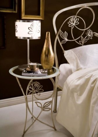 - Style assorti... Une table de chevet ne devrait pas être la pièce principale si ce n'est pas une œuvre d'art ou des antiquités. Pour le style arabe, des modèles ajourés et gracieux sont choisis, la haute technologie suppose la brièveté et la sévérité des lignes. La table dans l'esthétique du loft sera simple, mieux cuivrée, avec une patine, les traditions provençales seront soulignées par des meubles forgés avec inserts en bois, éraflures. Les classiques sont mieux incarnés dans une combinaison de forgeage avec une gamme de bois précieux.