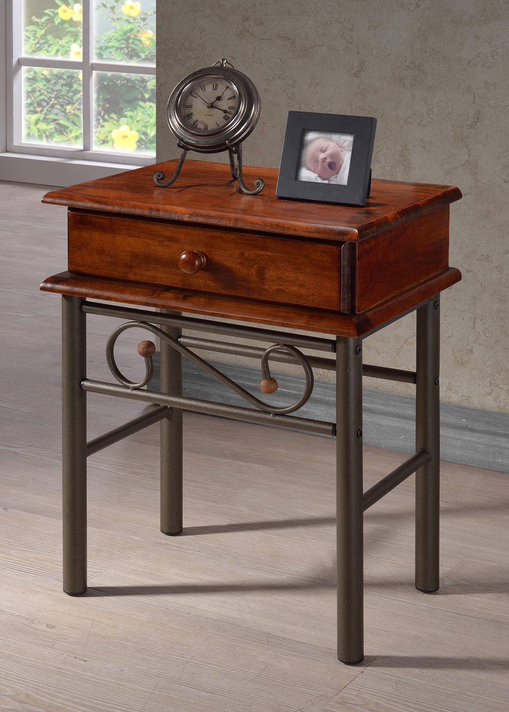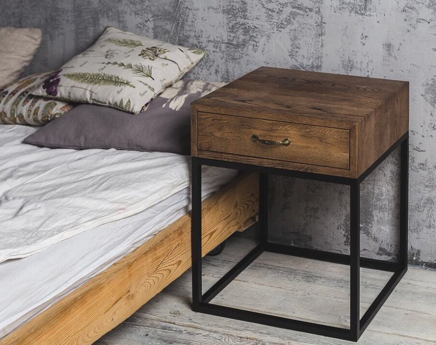 - Version classique avec tiroir et plateau en bois massif. Le forgeage n'est présent qu'à la base, faisant écho au design du lit.
