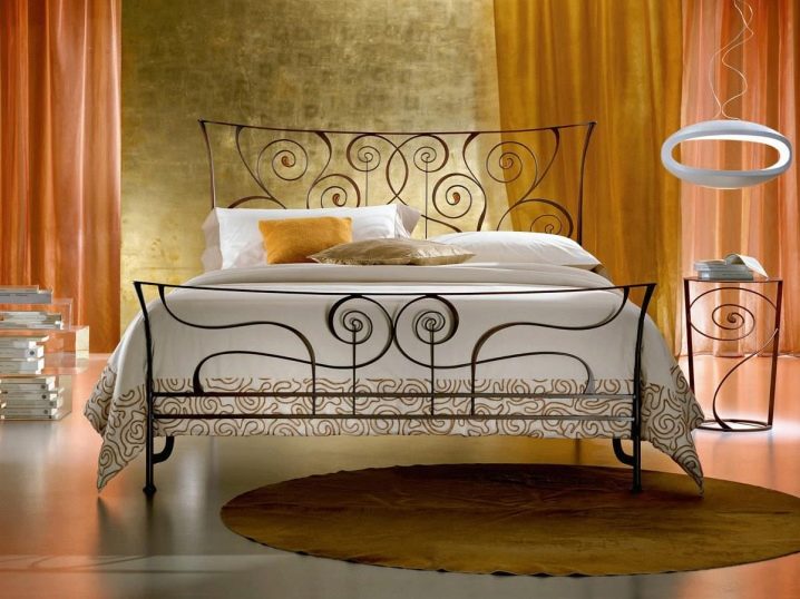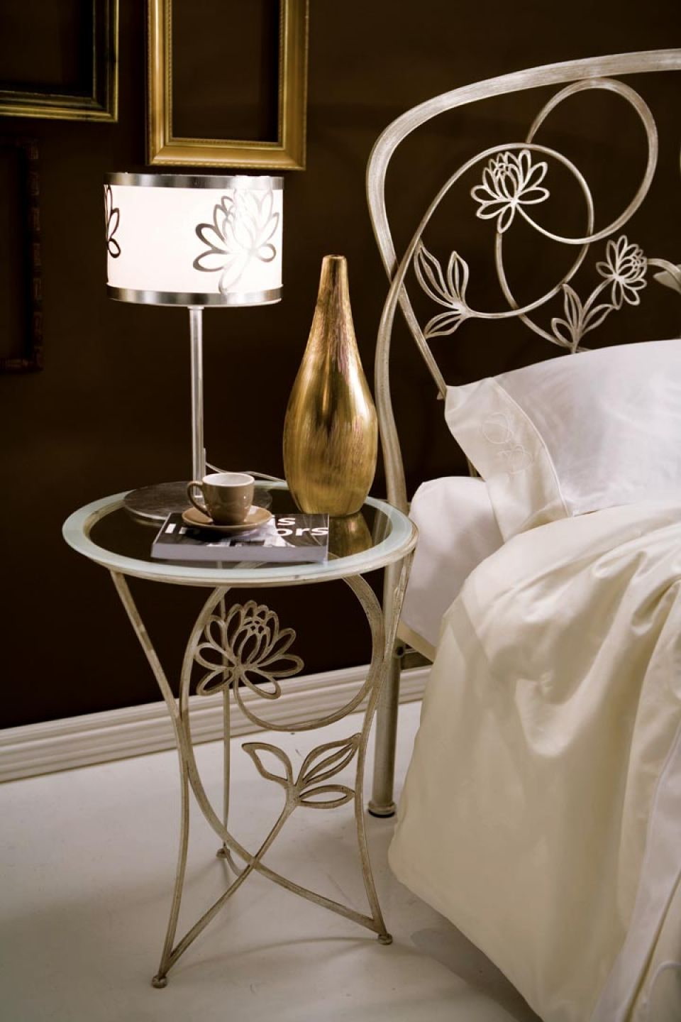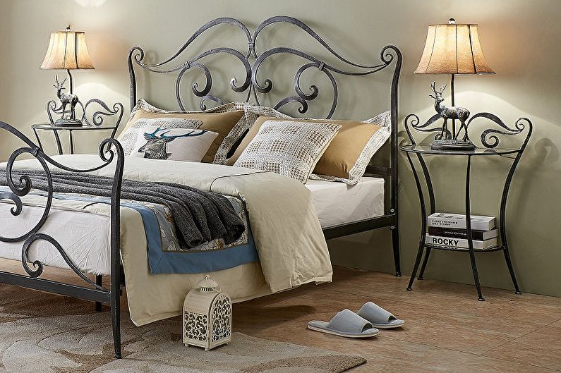 - Type de métal et méthode de forgeage. Traditionnellement, les produits fabriqués à l'aide de la technique de forgeage libre sont les plus impressionnants dans une chambre à coucher. Ils sont délicats et ont fière allure avec d'autres éléments à l'intérieur. Si le choix est fait en faveur de l'emboutissage, il vaut mieux ne pas privilégier les modèles trop complexes, ils auront l'air bruts et massifs. Les tables en cuivre forgé à froid, laiton, aluminium conviennent aux chambres meublées sans splendeur inutile.
