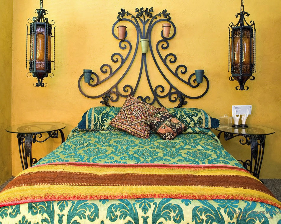 Des tables spectaculaires et insolites avec un piètement en fer forgé ajouré encadrent l'espace lit. C'est une excellente solution pour une pièce de style moyen-oriental.