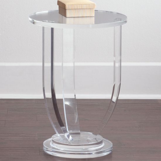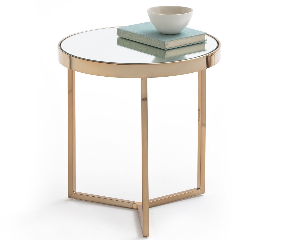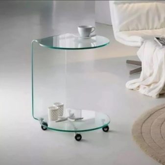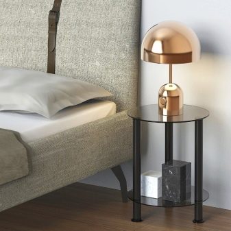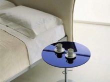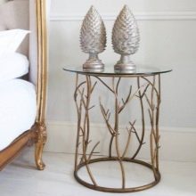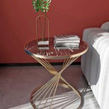- Un verre. Pour la fabrication de plateaux de table de chevet modernes, un verre trempé spécial est souvent utilisé. Il est très résistant et les bords sont facettés. Cela éliminera les blessures. Quant au piètement ou aux pieds, des options sont ici possibles : du bois et même du plastique à la pierre et au forgeage du métal. De tels produits semblent très avantageux et la surface transparente ajoute de la légèreté et de l'air à l'espace, s'intègre dans presque tous les intérieurs.