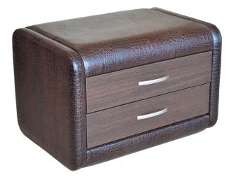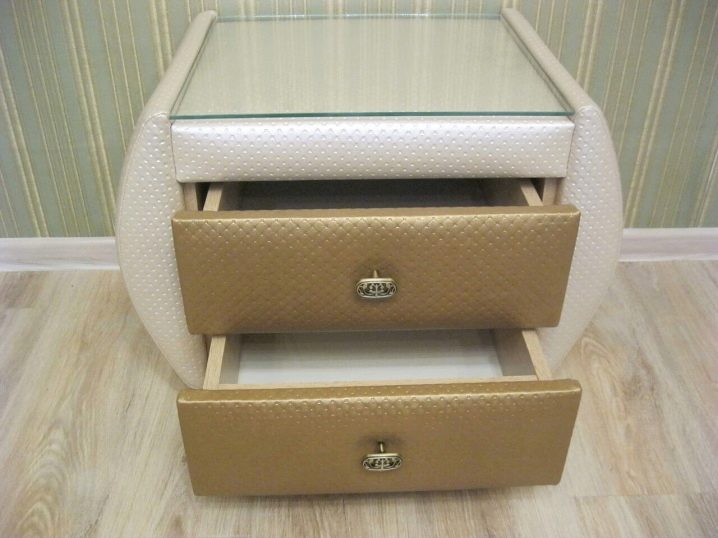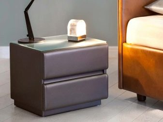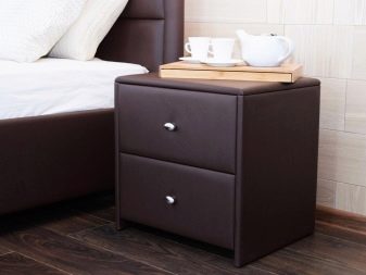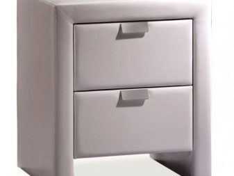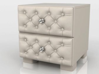 Les matériaux de finition extérieure sont cuir véritable, éco-cuir, arpatek, microfibre, velours, cretonne, fourrure artificielle, velours. Les modèles en cuir sont plus pratiques en termes de fonctionnement et d'entretien. Ils n'ont pas peur de l'humidité, faciles à nettoyer, ne se décolore pas. La texture du matériau peut être laconique, lisse ou gaufrée. La plus belle option est un attelage de chariot. Il peut être situé sur les façades des tiroirs ou sur le boîtier.