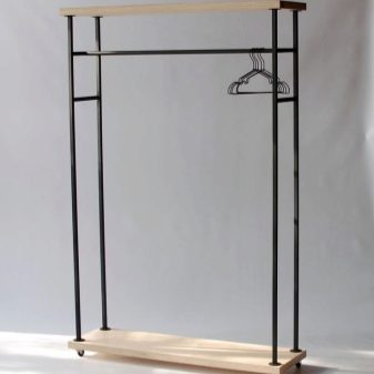 - Les modèles combinés combinent plusieurs matériaux. La base peut être une structure métallique, qui est complétée par des éléments en bois ou des pièces en plastique. Ceux-ci peuvent être des supports, des crochets, des supports.