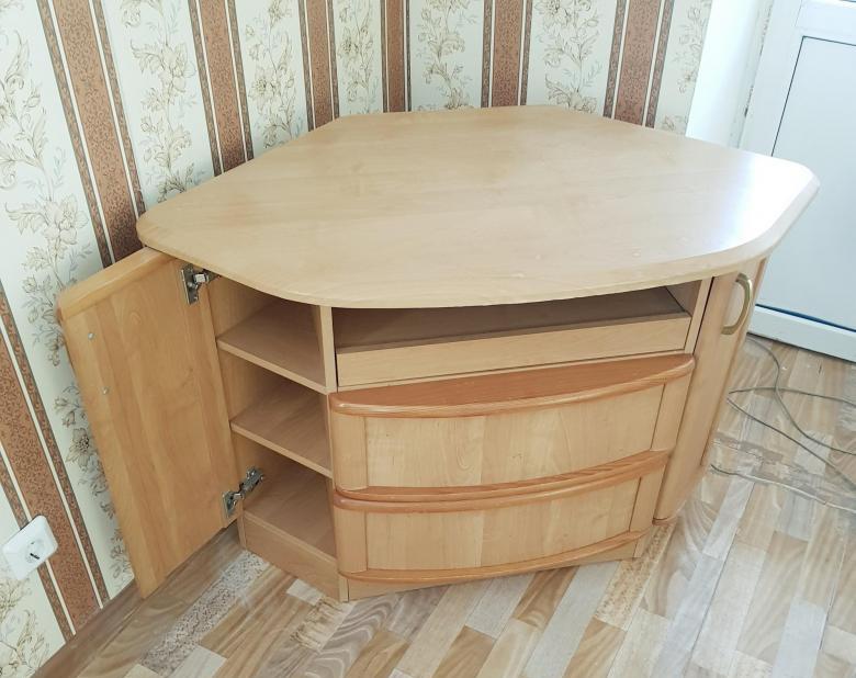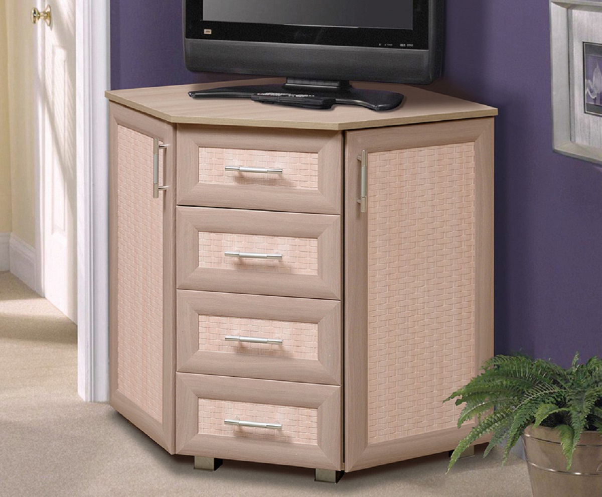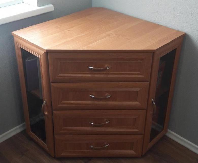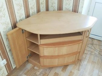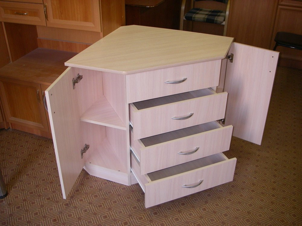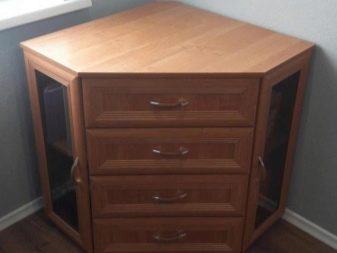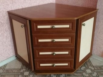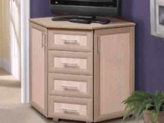 S'il n'y a pas assez d'espace près du mur, ils achètent une table de chevet d'angle. Il n'est pas moins spacieux et fonctionnel que le droit, mais prend moins de place et est parfait pour une petite pièce. De par sa conception, il peut être soit à tiroirs, soit à une ou plusieurs portes.