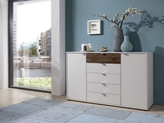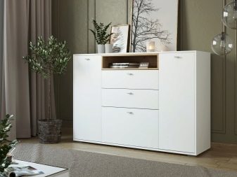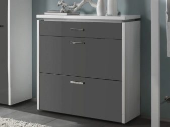 Mais les petites choses sur les étagères ne sont pas pratiques à ranger. Pour cela, vous aurez peut-être besoin d'organisateurs supplémentaires. De telles armoires au design laconique sans éléments décoratifs inutiles conviennent bien aux amateurs de minimalisme. Lorsque vous choisissez un produit avec des portes battantes, vous devez faire attention à la qualité des ferrures. En cas d'utilisation fréquente, les charnières bon marché tomberont rapidement en panne.