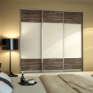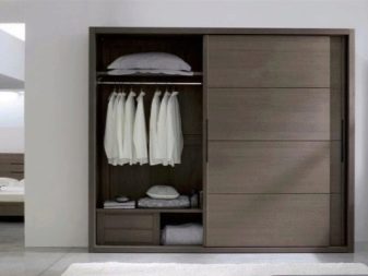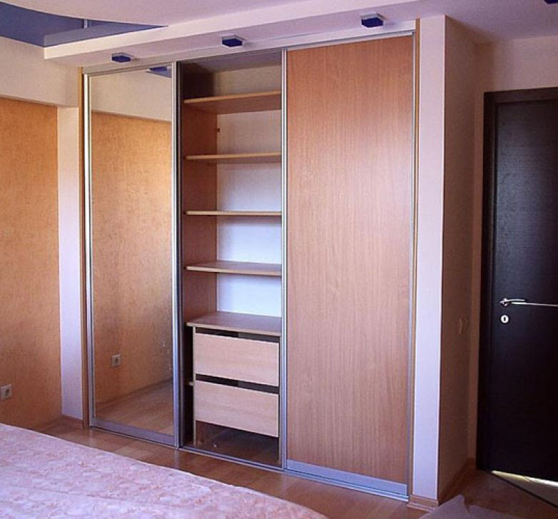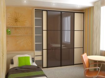 En fonction de l'organisation interne de l'armoire, elle peut être à deux ou trois portes. Une solution audacieuse et originale serait une armoire à une porte, dont le panneau coulissant dans différentes positions peut couvrir le lit, par exemple, et des étagères avec des vêtements.
