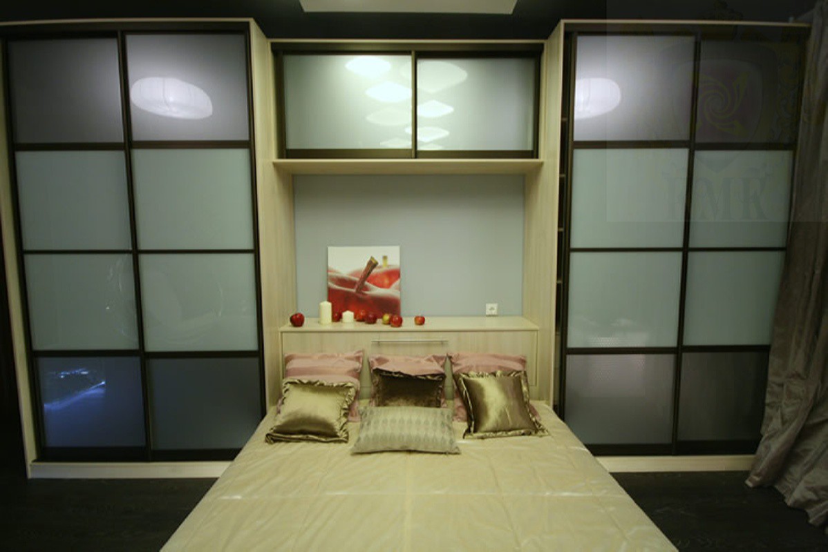 Si la profondeur et la hauteur de la niche le permettent, le lit pliant ou le canapé pliant peuvent être rangés directement à l'intérieur. Pour les petits studios, tout simplement un moyen irremplaçable d'organiser l'espace comme vous le souhaitez.
