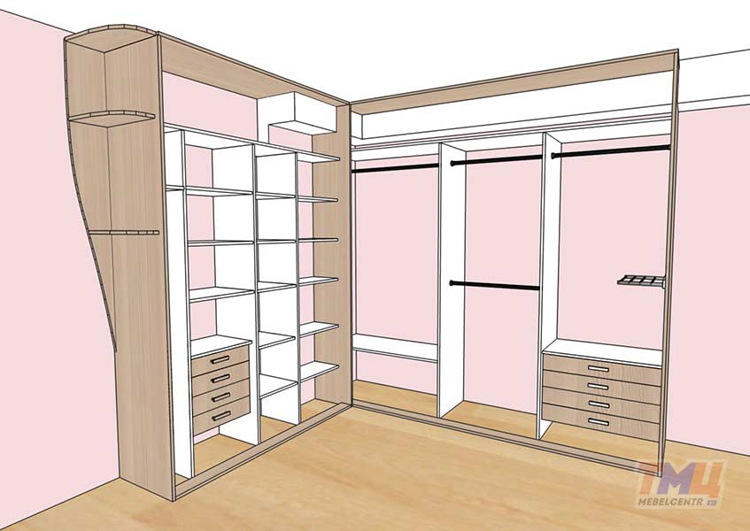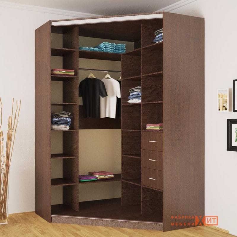 L'espace de vie n'a pas toujours une telle disposition comme nous le souhaiterions. L'emplacement des portes laisse parfois des coins entiers inutiles, empêche d'y placer d'autres meubles. L'armoire triangulaire étroite et allongée a l'air miniature, mais vous permet d'utiliser toute la surface utilisable. L'armoire à cinq parois profonde et spacieuse ressemble à une forme de pierre précieuse et ses "bords" latéraux augmentent considérablement le volume à l'intérieur. Si la pièce a une disposition inhabituelle ou si un design original est prévu, vous pouvez vous arrêter devant une armoire trapézoïdale de forme irrégulière à quatre murs.