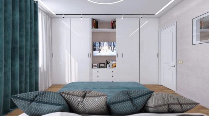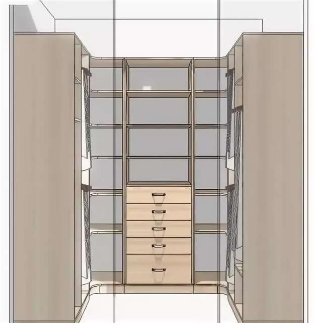 Une immense armoire, adjacente à trois murs à la fois, est capable de cacher complètement en elle-même un endroit pour dormir, un lieu de travail et une coiffeuse. Cependant, la forme en U est souvent utilisée pour organiser un dressing, même dans de petites niches.