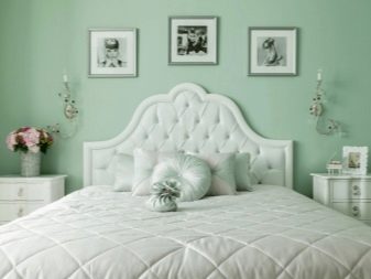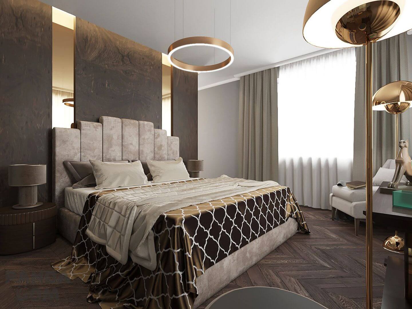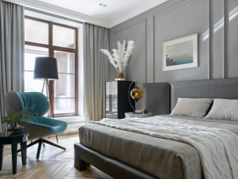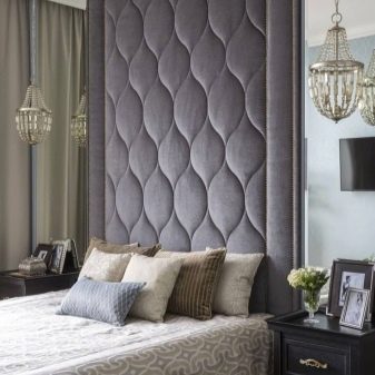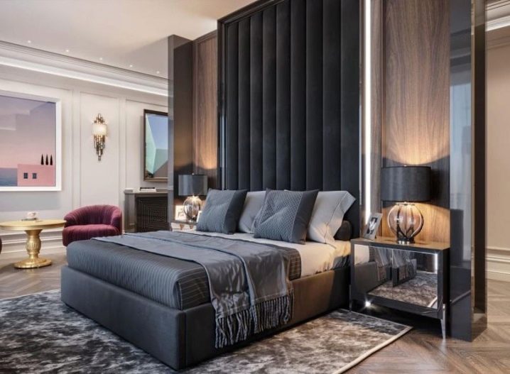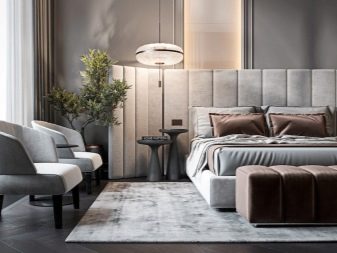 - Les lits modernes avec une tête de lit haute jusqu'au plafond ont l'air avantageux, ils sont généralement fabriqués à partir de textiles de haute qualité... L'image globale de l'intérieur est complétée par un petit coin salon, qui comprend 2 fauteuils lumineux et une table basse en métal.