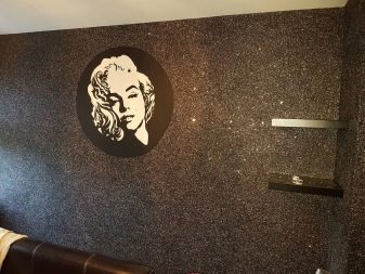 - Le papier peint liquide sont également inclus dans les matériaux les plus demandés. Ils ont une large gamme de couleurs et de textures diverses. Ils sont également disponibles à l'achat. Les options de paillettes semblent particulièrement avantageuses. Il est logique de les utiliser si vous souhaitez créer un revêtement sans couture sur les murs de la chambre.