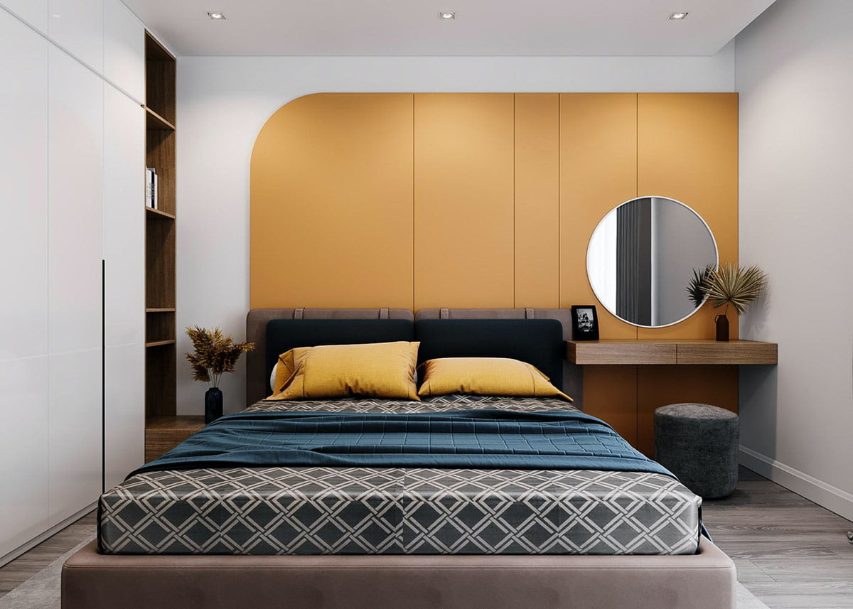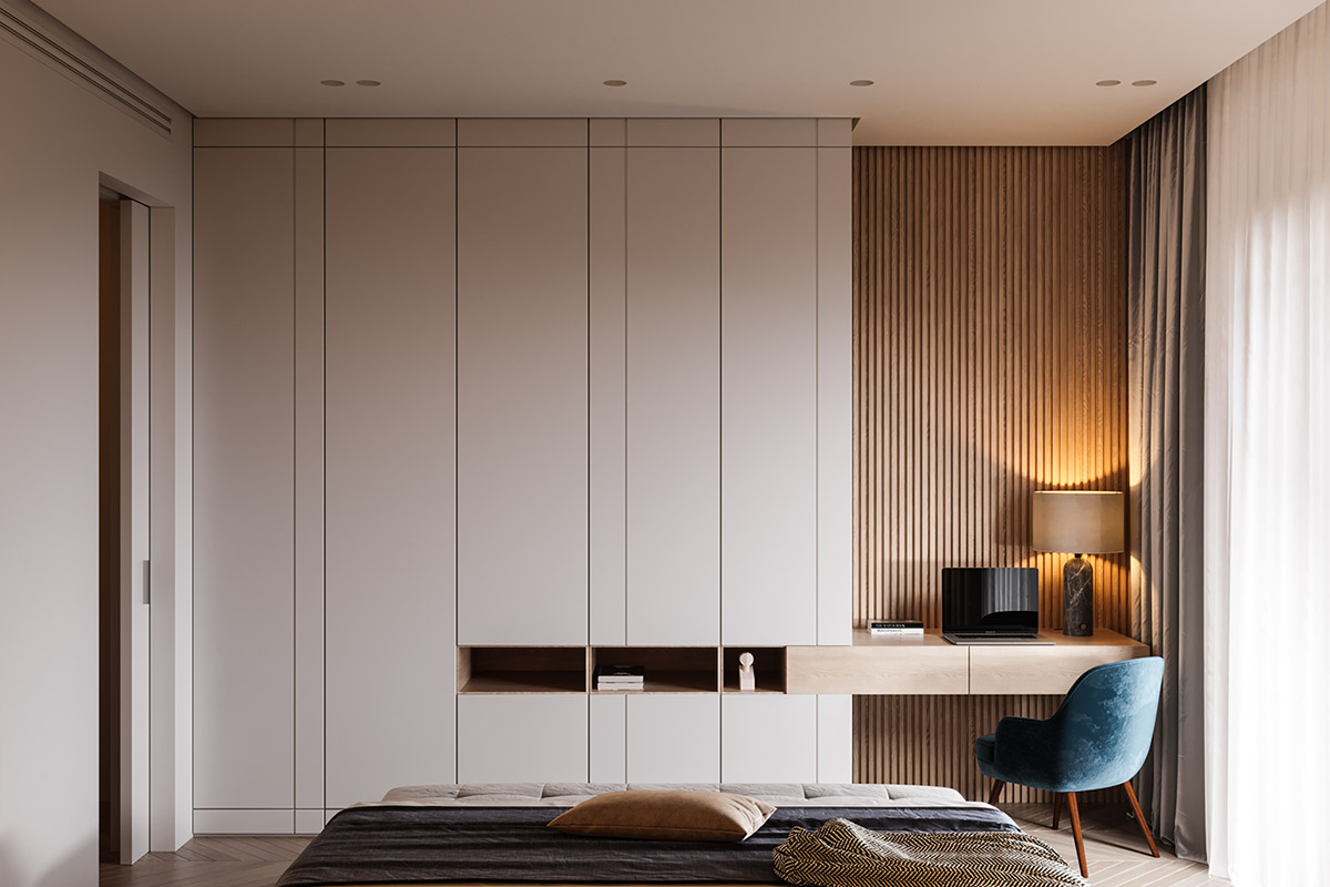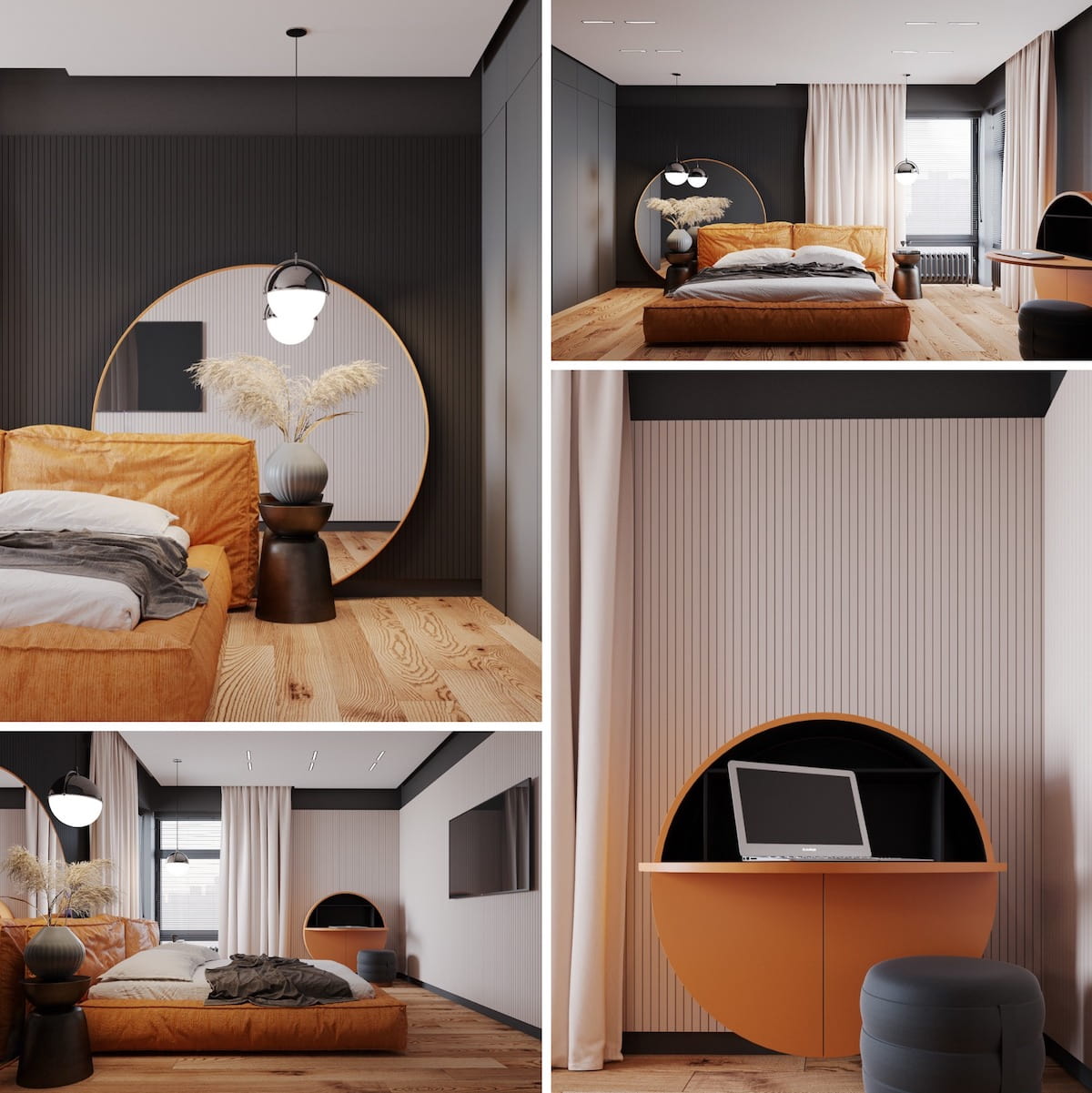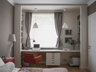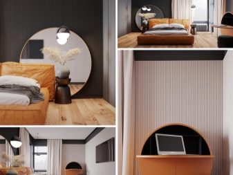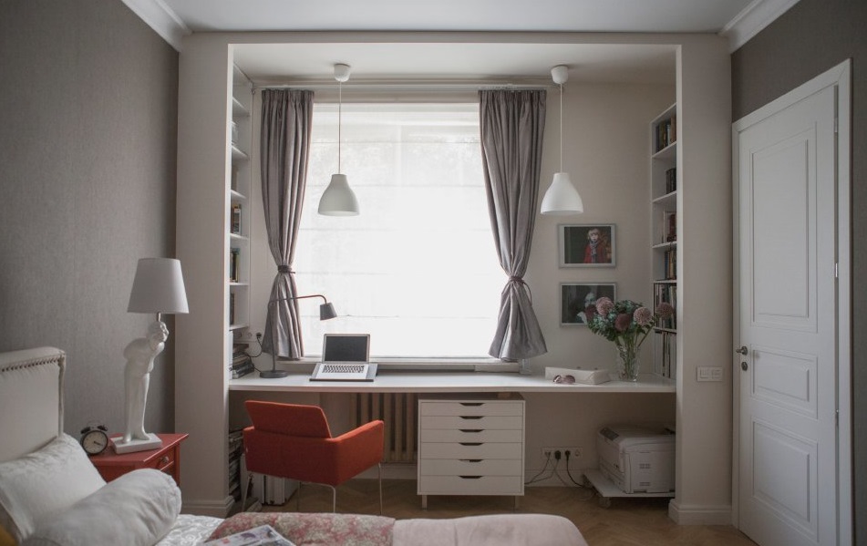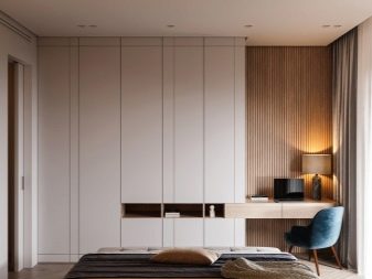 - Les nouvelles tendances suggèrent fonctionnel utilisation de chaque mètre gratuit dans la chambre, surtout lorsqu'il s'agit d'un petit appartement ou d'une petite maison. Si un immense placard ne rentre pas dans la pièce, privilégiez un dressing ouvert. Et s'il est nécessaire d'installer un lieu de travail dans la chambre, il peut, par exemple, être installé près de la fenêtre ou dans tout autre espace libre de la pièce, où il peut être joué avec succès avec l'intérieur.
