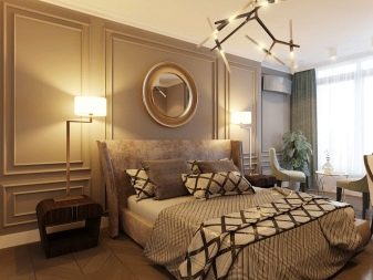 - Art Déco... Les chambres Art déco, semble-t-il, ne se démoderont pas avant longtemps, car elles ont l'air vraiment luxueuses. Ils plairont à ceux qui aiment les meubles laconiques, les textiles coûteux dans la chambre et l'éclairage de haute qualité. Ce style implique l'utilisation de nuances claires et sombres dans la conception de la chambre, ainsi que leur combinaison réussie les unes avec les autres. Pour ce style, il est important d'utiliser des meubles rembourrés, ainsi que des lits avec une tête de lit en velours ou tout autre textile. En outre, une caractéristique de ce style peut être appelée l'installation de panneaux de miroir dans la chambre, ils sont généralement placés sur les côtés du lit.