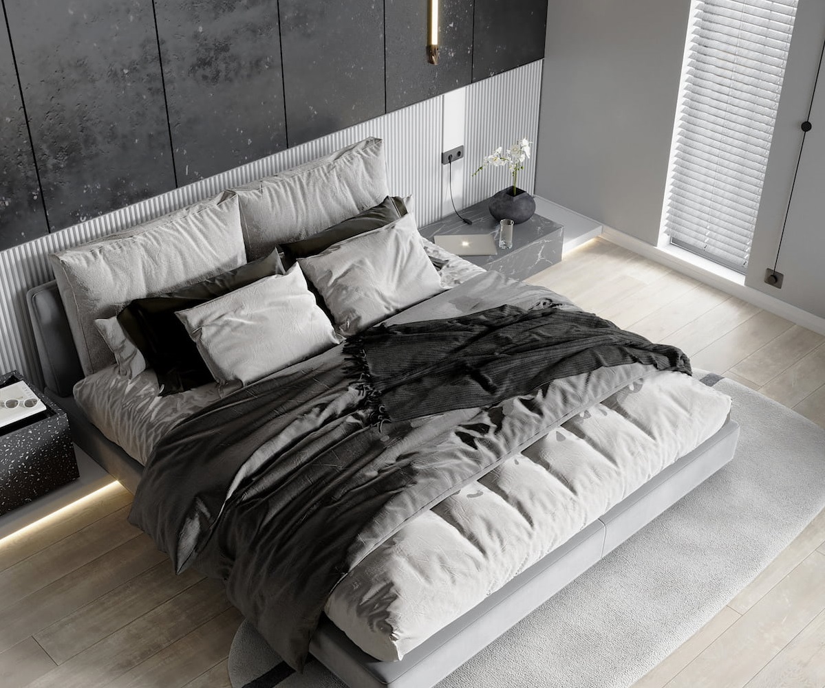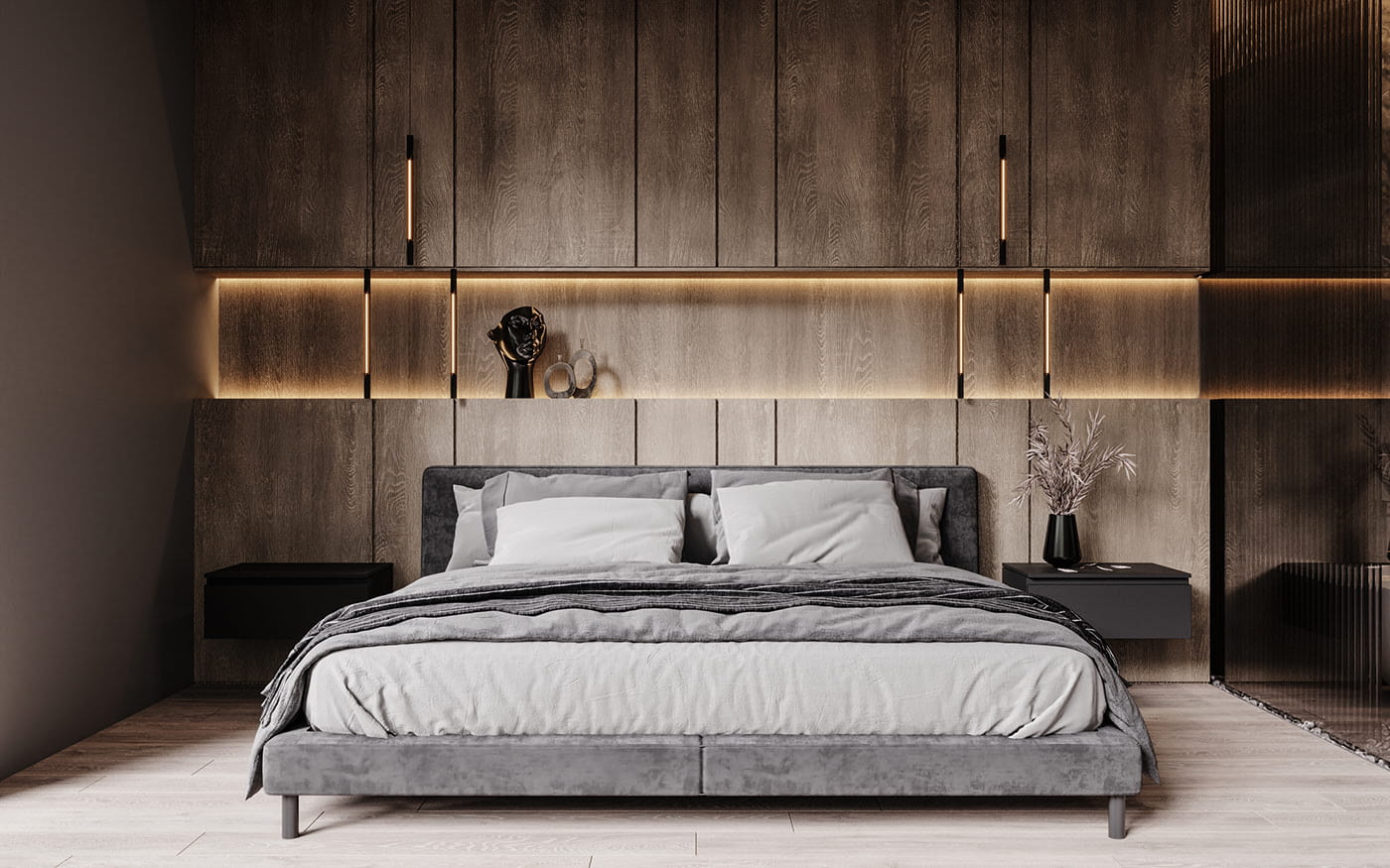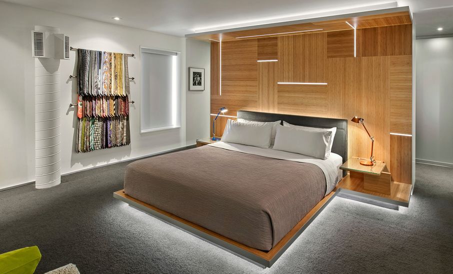 Les meubles de chambre sont considérés comme pertinents. avec rétroéclairage intégré, il en va de même pour les panneaux muraux, qui peuvent être situés, par exemple, derrière le lit, et des bandes LED peuvent être situées entre eux.