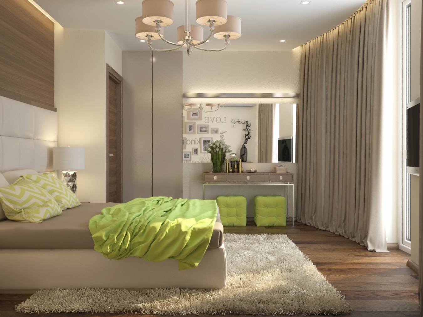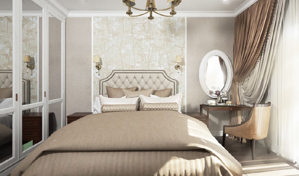 - Vous pouvez également décorer avec élégance une petite chambre.... Pour ce faire, vous pouvez utiliser des nuances de beige et de sable, ainsi que toute autre palette de couleurs chaudes. S'il n'y a pas assez d'espace libre, la coiffeuse peut être placée à proximité immédiate du lit. Le manque d'espace pourra certainement compenser les nuances claires, agrandissant visuellement l'espace, ainsi qu'un éclairage artificiel de haute qualité.