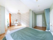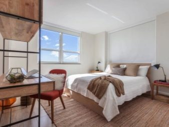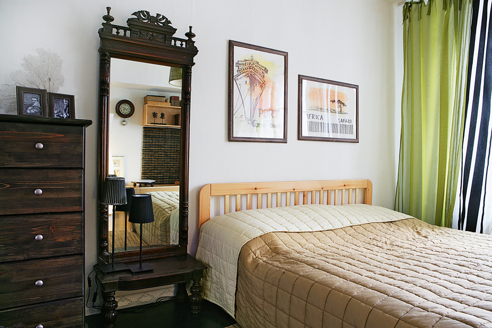 - Un excellent exemple de placement de miroir. Il est accessible, aucun objet n'interfère avec son utilisation. En même temps, il ne reflète pas le lit et les traverses et n'est pas situé en face de la porte.