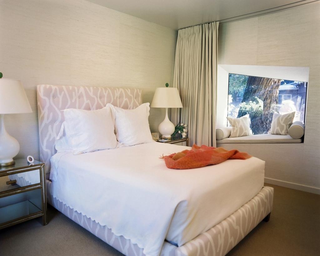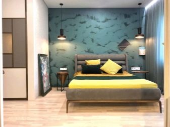 - On peut également voir ici que le lit est positionné de telle manière qu'il y ait une approche libre de trois côtés. Aux pieds se trouve un pouf rectangulaire aux angles arrondis. Les peintures sont abstraites et calmes. Le lieu de couchage est situé correctement, à l'écart de l'entrée.
