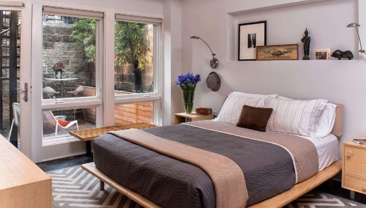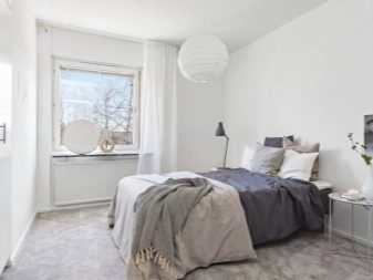 - La chambre est conçue dans un style minimaliste. Le lit est au milieu de la pièce et les pieds sont de l'autre côté de la porte. Les images, comme prévu, sont accrochées sur le côté du lit. Il y a un petit bouquet de fleurs rouges sur la table de chevet pour attirer la chance dans la maison, le linge de lit lui-même est sans imprimé floral.