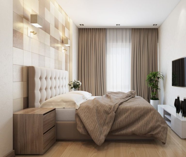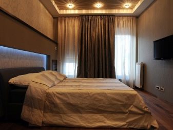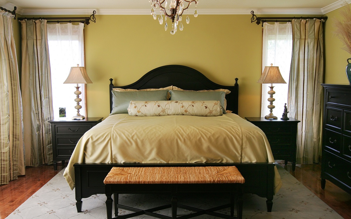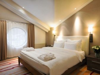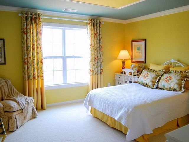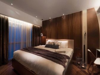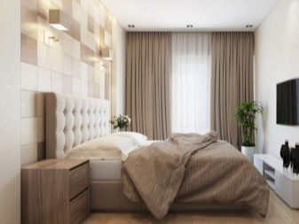 Les rideaux de la chambre doivent être sombres et denses. Ainsi, ils seront en mesure de protéger la zone de couchage des rayons solaires indésirables. Mais le linge de lit doit être léger - citron, linge de lit, beige, blanc. Il est préférable que les meubles contrastent avec les murs. Dans le même temps, l'intérieur ne doit pas être trop lumineux.