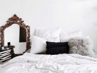 Il n'est pas recommandé de mettre un miroir devant un lit. Cela peut conduire à des querelles entre les membres du ménage. Il est préférable de le mettre dans un endroit où le lit ne sera pas complètement reflété. S'il n'y a pas d'autre moyen de mettre le miroir, vous devez le rideau avec des rideaux occultants qui seront attachés à la baguette.