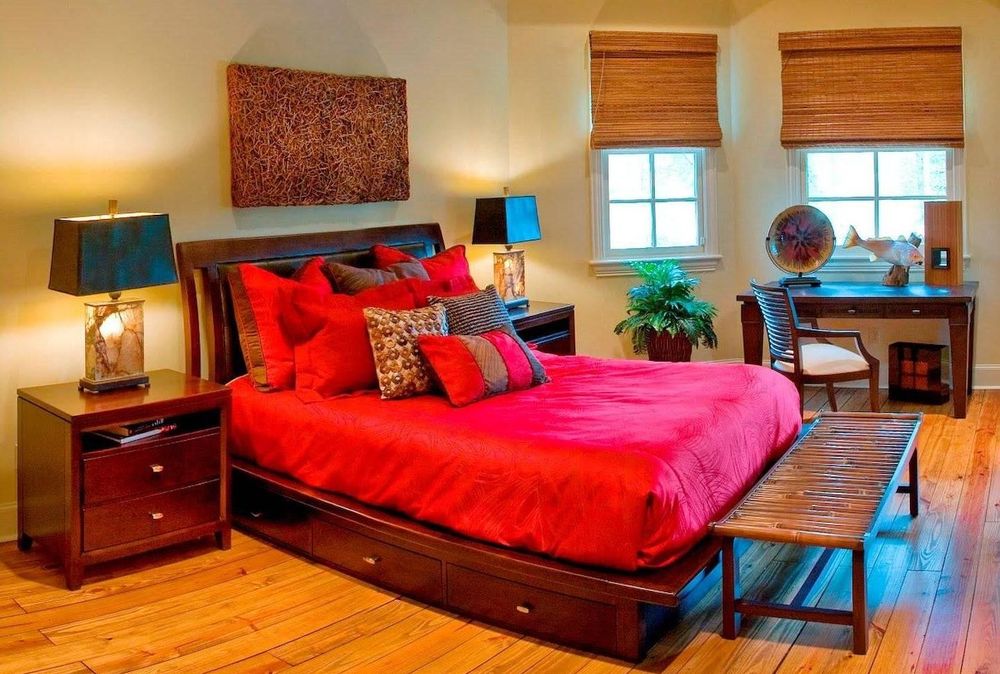 - Sud. Il est préférable d'utiliser ici des couleurs vives et juteuses: terre cuite, cerise, orange, rouge. Ils peuvent être combinés avec d'autres nuances vibrantes. L'essentiel est que le résultat ne soit pas trop varié et ne gêne pas le sommeil.