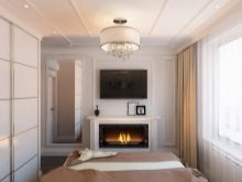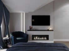 Si la chambre est petite, des miroirs pouvant être placés au-dessus de l'appareil agrandiront visuellement l'espace. Il vaut également la peine d'installer un téléviseur dans ce domaine. Dans une chambre classique, la place au-dessus de la cheminée peut être décorée avec des objets de décoration - peintures, photographies.