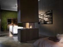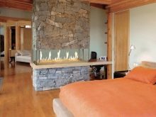 - Ostrovnoy. Idéal pour les grandes chambres. La cheminée deviendra certainement le point culminant de la pièce, tandis qu'un foyer en verre sur un support en bois sera très beau.
