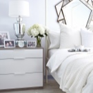 - Et dans cette chambre, il manquait un miroir aux propriétaires et ils ont décidé de tout prendre d'un coup. Eh bien, si ce n'est pas tous, alors beaucoup. Tout un panneau décoratif a été créé au-dessus du lit, et une place a été trouvée pour le miroir principal près de la commode. Et puis, l'essentiel n'est que nominalement, car des deux côtés du lit, il y a deux autres miroirs plus grands et, ce qui est important, pas identiques.