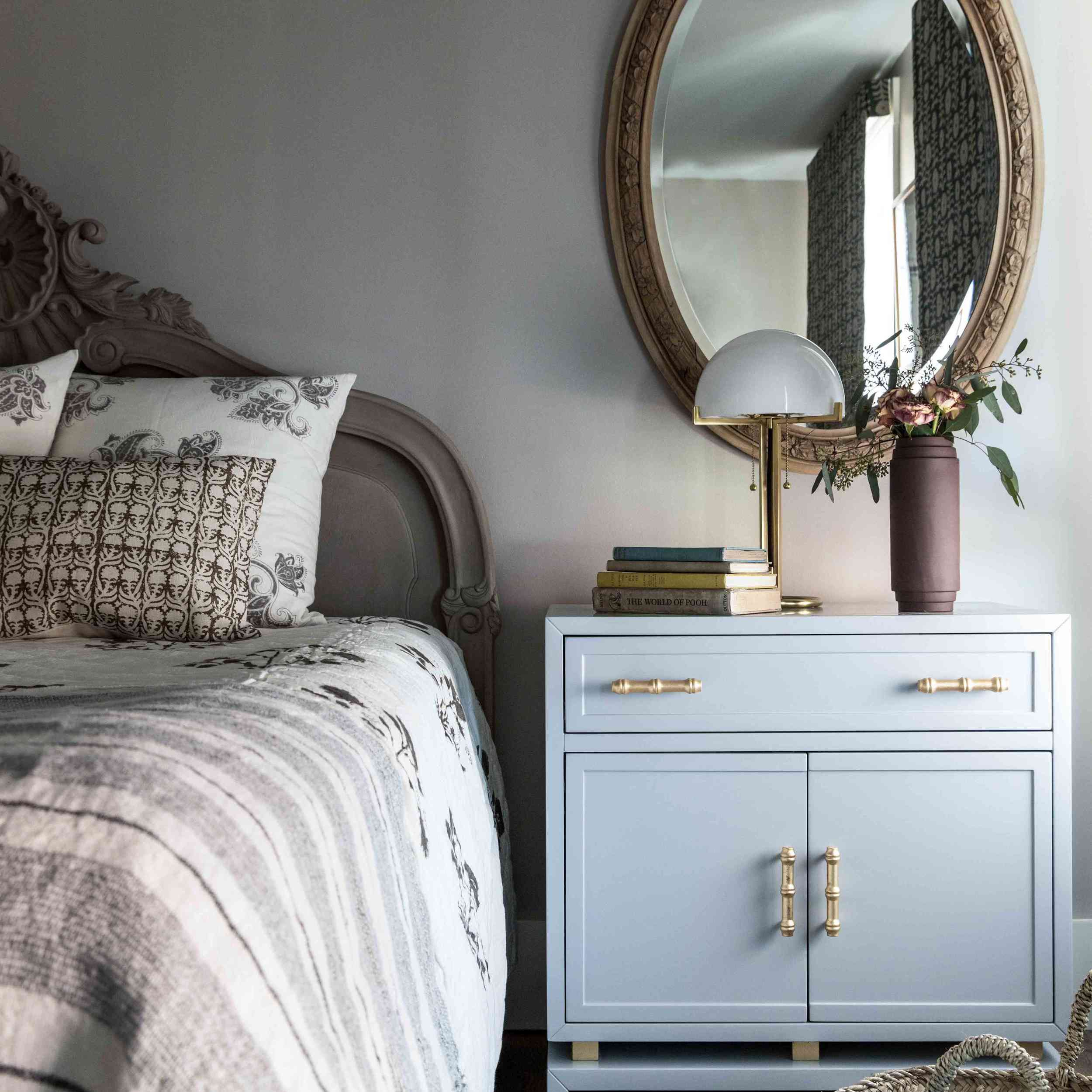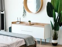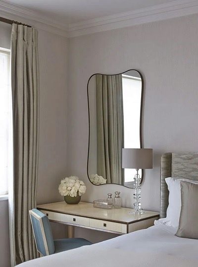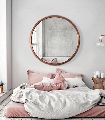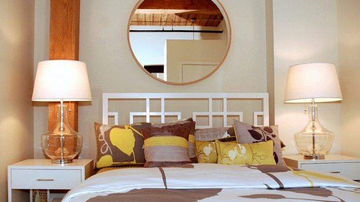 - Au contraire, un miroir délicat aux contours lisses au-dessus de la table n'attire pas beaucoup l'attention, ne dérange pas ceux qui sont sur le lit. La forme, agréable à l'œil, s'intègre bien dans un intérieur calme et élégant.