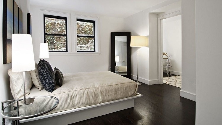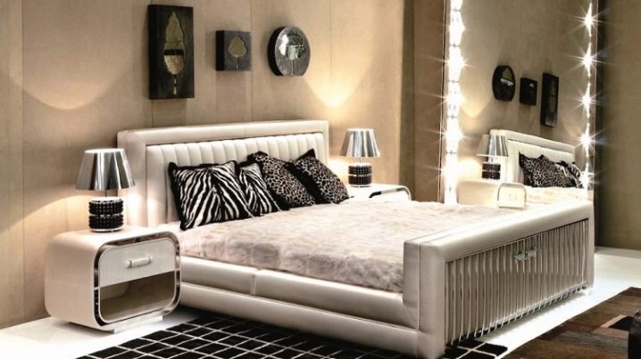 - Un grand miroir avec un éclairage loin d'être modeste se trouve directement sur le sol et juste sur le côté du lit. Cette option ne convient pas à tout le monde, mais ceux qui s'aiment et leur image devraient l'aimer. On l'appelle sans fausse modestie.