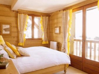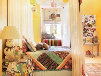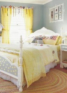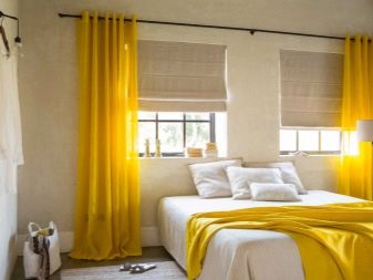 Les murs unis feront des rideaux un accent lumineux de l'intérieur. Ici, vous pouvez autoriser des accessoires avec une impression sous la forme de motifs ethniques colorés, d'ornements géométriques, de riches motifs floraux qui s'harmonisent parfaitement avec l'environnement. Les rideaux colorés de la chambre jaune sont parfaits pour les motifs provençaux, champêtres et shabby chic.