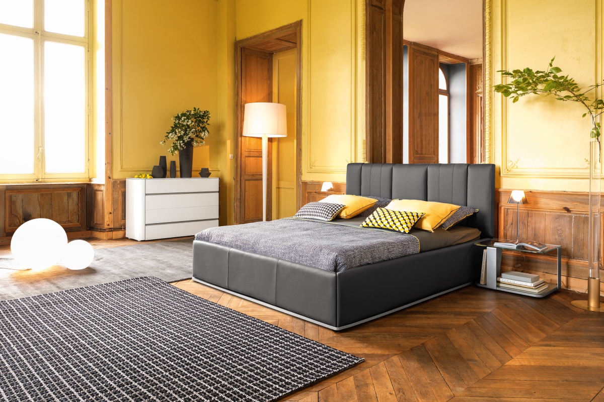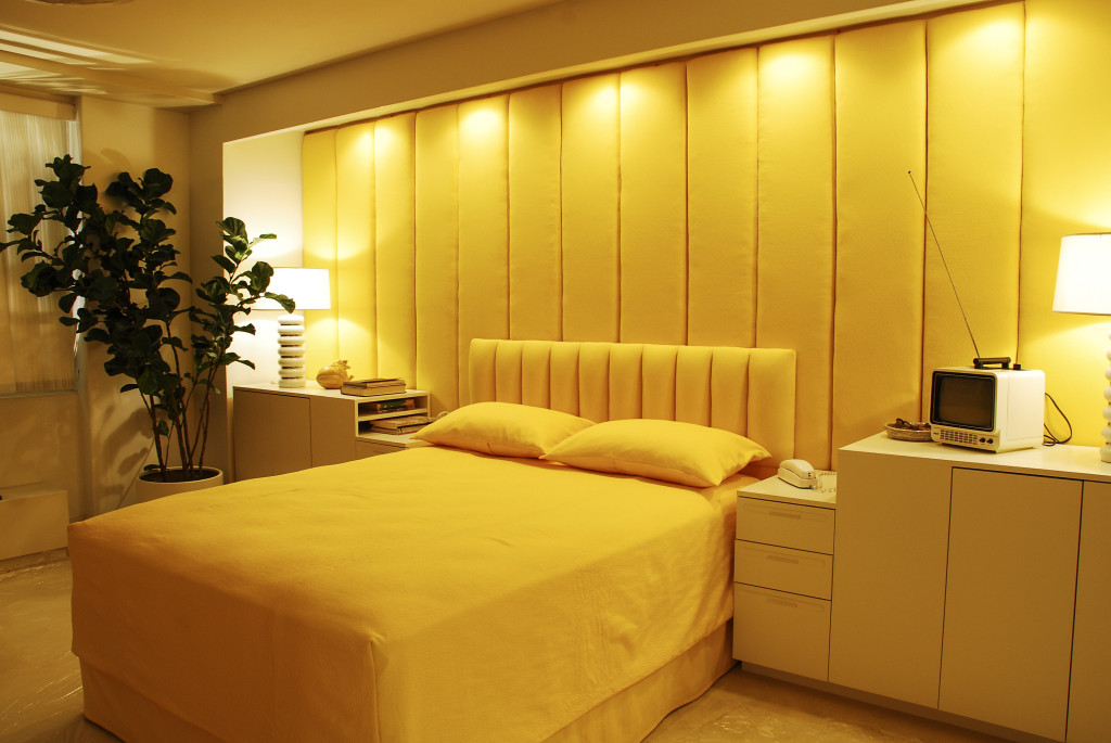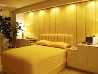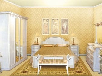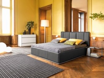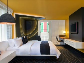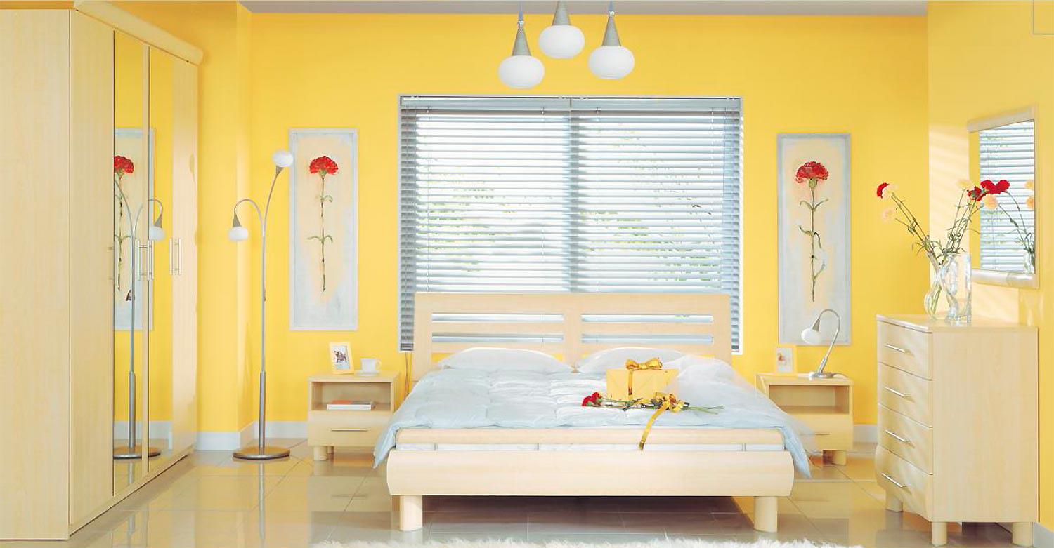 À l'intérieur jaune, les ensembles de chambre clairs avec une surface brillante ont fière allure. Ils donnent de la légèreté, permettent de décorer la pièce avec différents accessoires assortis aux murs jaunes ou de couleur contrastante.