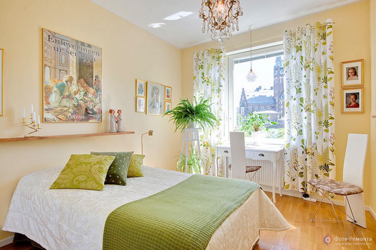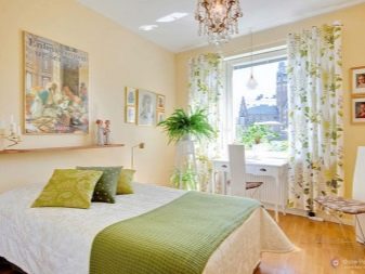 - Les murs monochromes pastel de couleur citron apportent la paix. Les rideaux blancs avec un imprimé végétal de feuilles jaune-vert et turquoise sont une décoration élégante pour la chambre. La riche teinte turquoise est reprise par les accessoires - un fauteuil en cuir confortable et un petit coussin en textile. Les taies d'oreiller jaunes soutiennent la décoration murale.