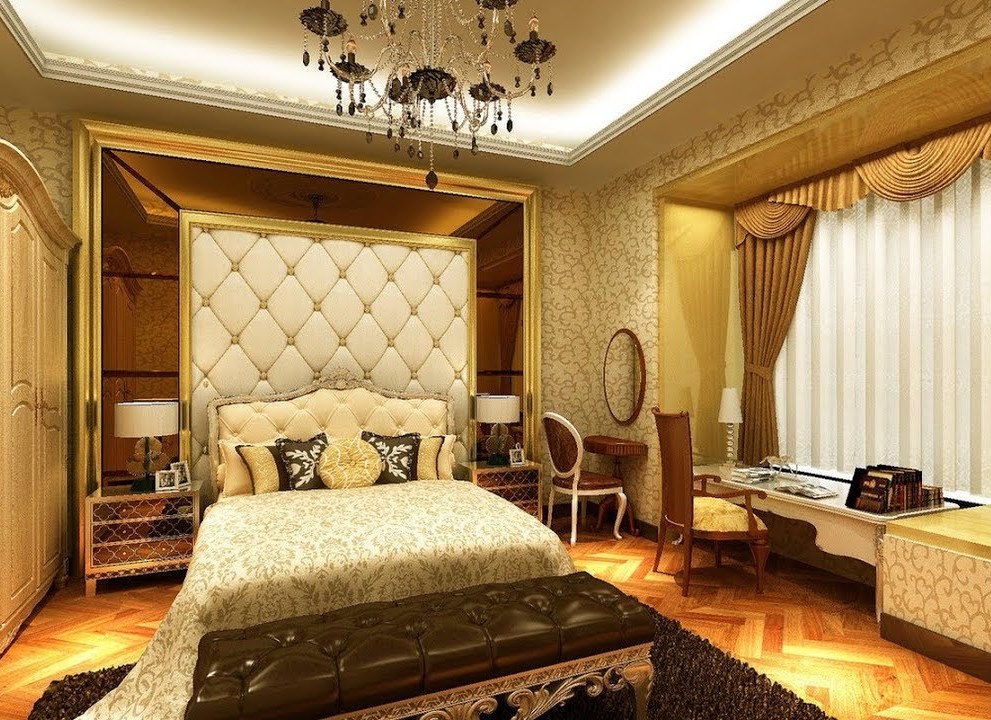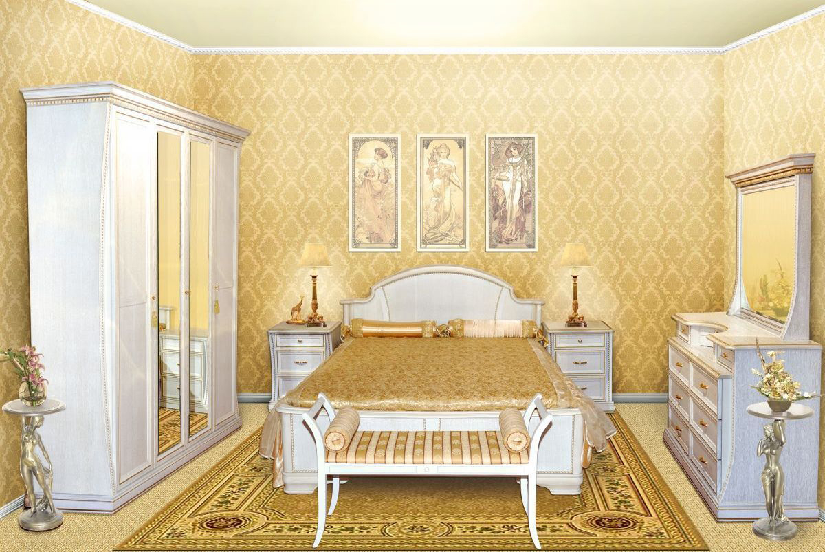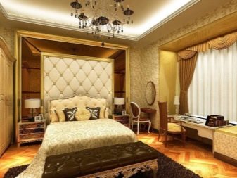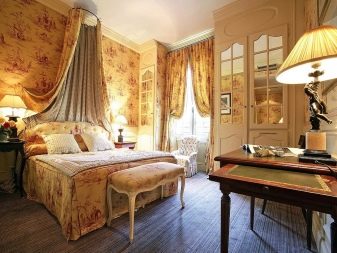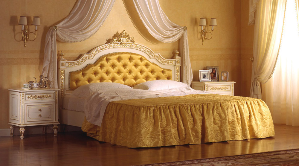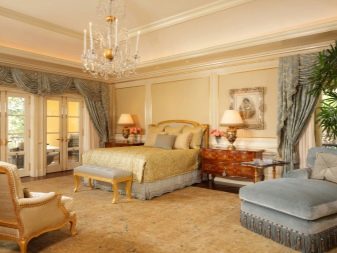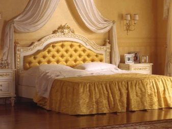 Sur fond de murs clairs, les lits avec une tête de lit sculptée massive ou un auvent décoratif sont magnifiques. Des tables de chevet massives et une coiffeuse complèteront le tableau d'ensemble.