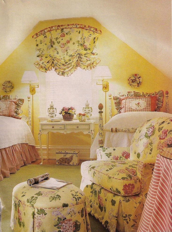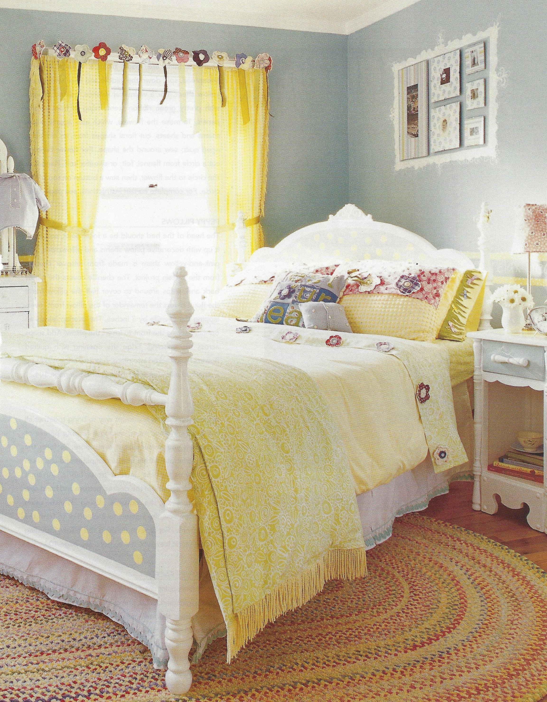 Solution de chambre dans les styles shabby chic et fusion - le jaune est utilisé de manière accentuée et est combiné avec la couleur du rose poussiéreux, du carmin, du fuchsia, du gris clair et du beige.