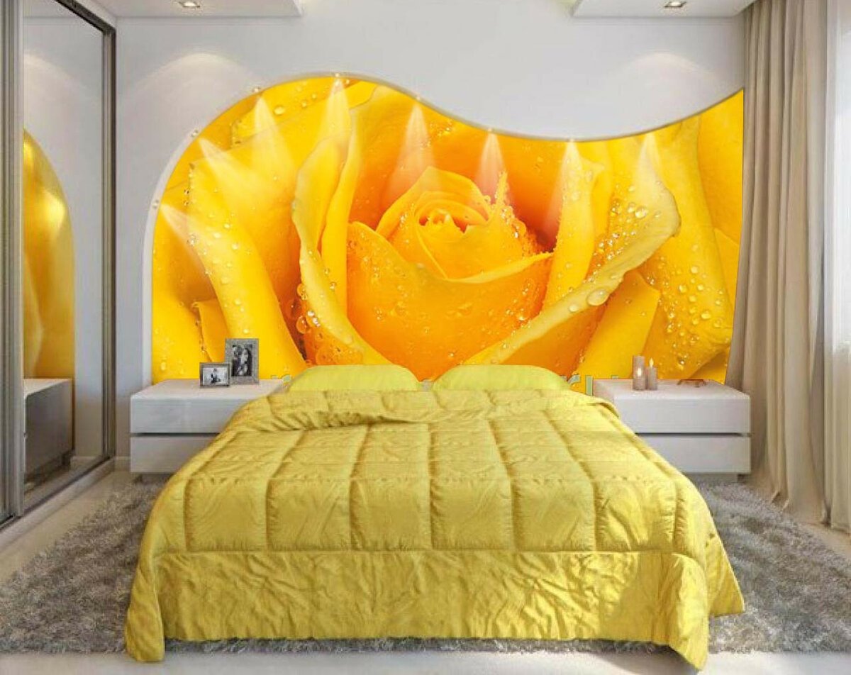 Le papier peint photo avec une rose thé crée une atmosphère romantique dans la chambre. La fleur jaune vif fait écho aux accessoires textiles. Le plafond suspendu et les meubles blancs comme neige semblent se dissoudre dans la pièce, laissant place au rôle principal de la décoration créative audacieuse sur le mur.