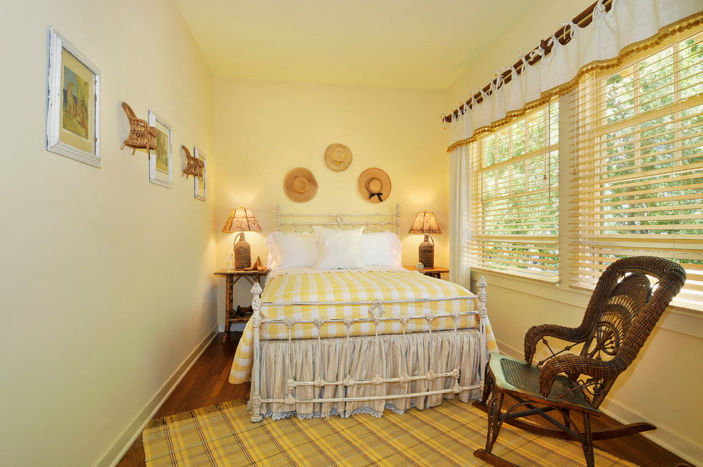 Conception de chambre à coucher de style campagnard idéal dans les jaunes sable clair combinés avec le beige, le brun foncé, le gris et le vert.