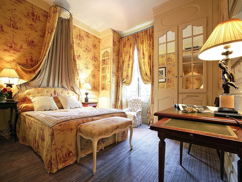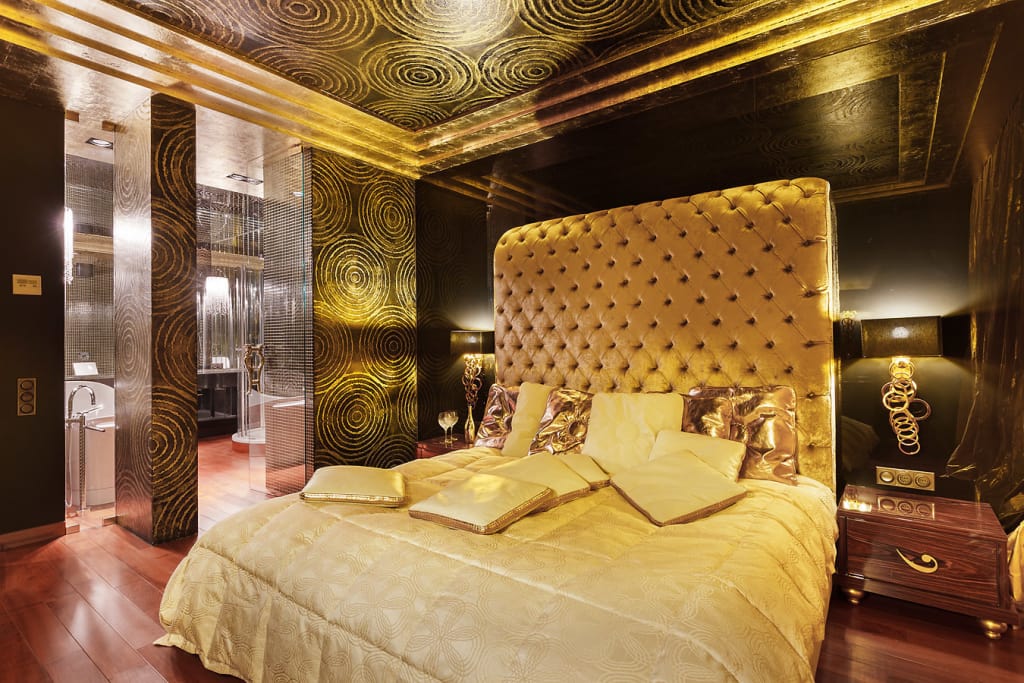 Dans la chambre au style éclectique la teinte ambrée et la couleur du mystérieux ciel nocturne sont magnifiques.