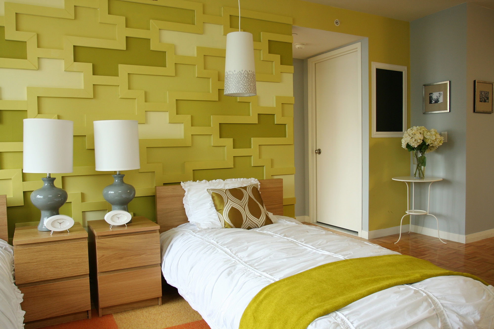 Chambre éco-style harmonieux dans une combinaison de couleurs jaune pastel et vert clair.