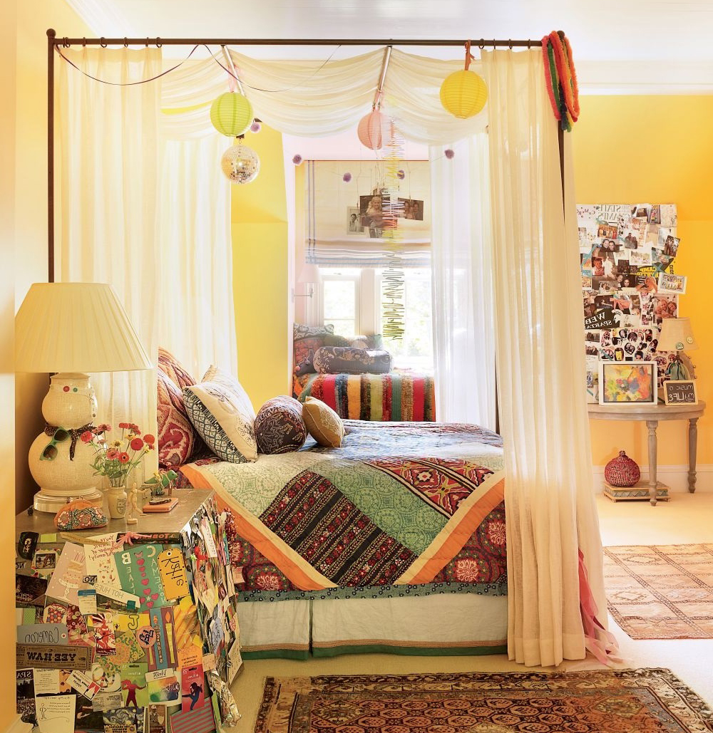 Mélange de nuances jaunes riches avec des couleurs douces poudrées, gris clair et sable rend la chambre ethnique mignonne et confortable.