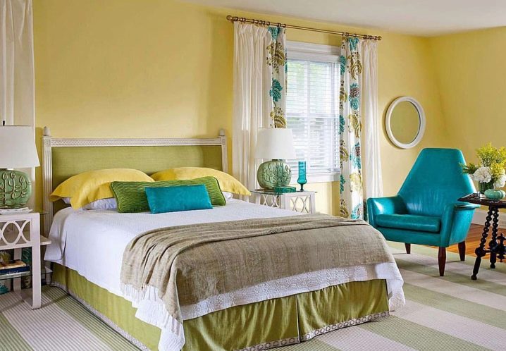 Les meubles colorés seront également une inclusion lumineuse dans le design ensoleillé. Il suffit de mettre un fauteuil turquoise ou vert dans la pièce, d'ajouter un accessoire sous la forme d'un couvre-lit et d'un oreiller - et la chambre scintillera d'une nouvelle manière.
