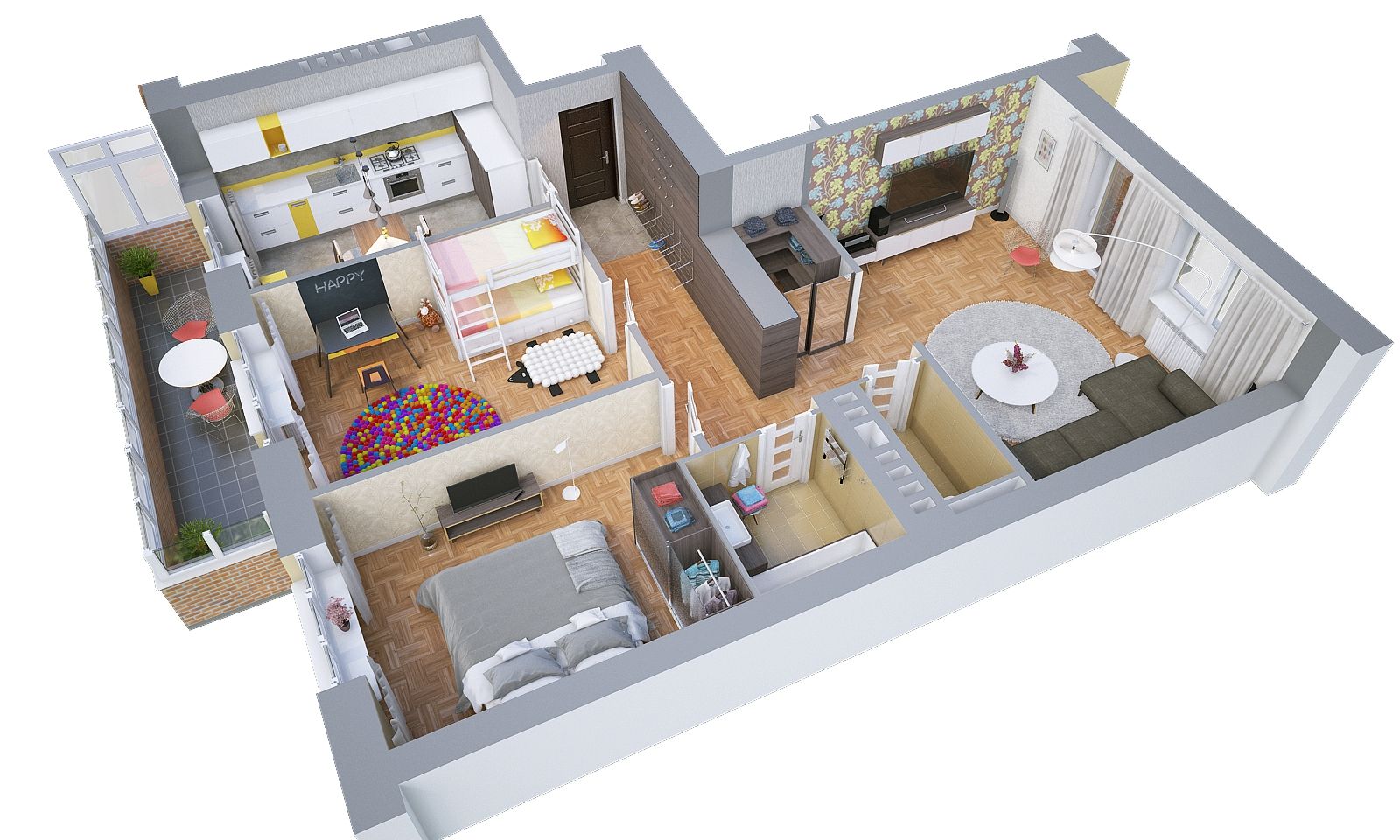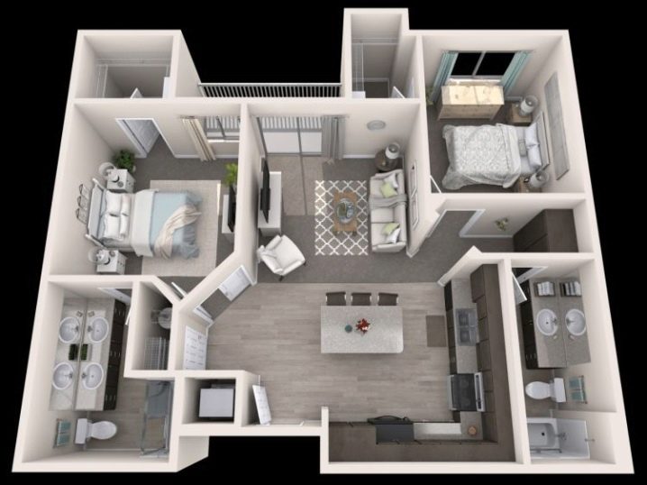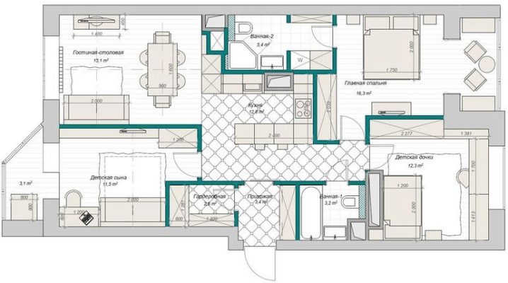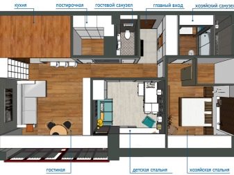 Lorsqu'un couple marié a deux enfants à peu près du même âge, vous pouvez les mettre ensemble à la crèche. Ensuite, il y aura un salon et une chambre pour les parents. Si les enfants sont de sexes différents, à un certain âge, ils devront vivre séparément afin que chacun ait sa propre chambre. Lorsque les enfants sont de sexes et d'âges différents, ils ont besoin de chambres séparées.Par conséquent, il est proposé d'abandonner un salon à part entière afin d'attribuer à chaque enfant une chambre. Dans les variantes avec une cuisine spacieuse, il devient un lieu de loisirs généraux.
